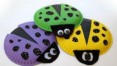 2. The second craft is made from paper plates. Paint the first paper plate black or use standard black paper plates. Paint the second paper plate with a color of your choice or use standard colored paper plates. Cut the second colored paper plate in half and position over the black paper plate, overlapping on one side to form the wings. Then cut a little face, eyes and dots out of paper and complete your ladybug.